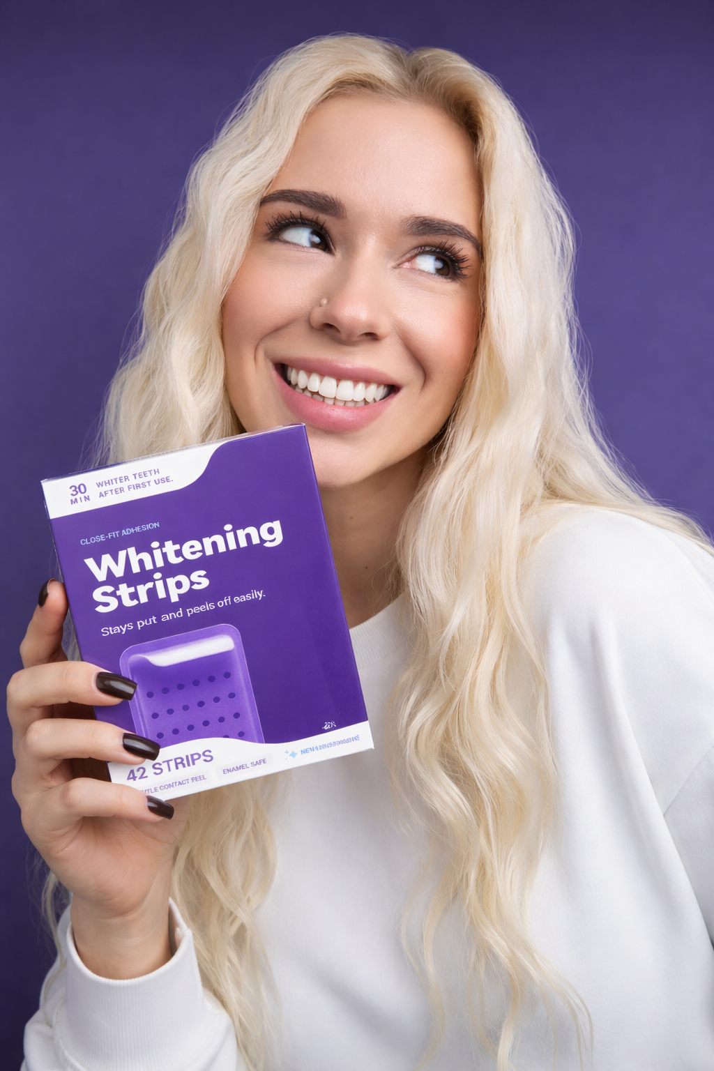 Our purple whitening strips are designed to visually neutralize yellow tones while helping your smile appear brighter and more refreshed. They’re easy to use, gentle on teeth, and made for real life—whether you’re getting ready for work, a night out, or just want to feel more confident day to day.